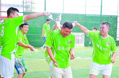 終場哨響后,菲比88二隊的隊員非常興奮,他們用潑灑香檳的方式慶祝捧得冠軍獎杯和2000元冠軍獎勵,本屆“銀豐·唐郡”杯濟(jì)南市籠式五人制足球業(yè)余聯(lián)賽就這樣在一片喜慶的氣氛中圓滿落幕。