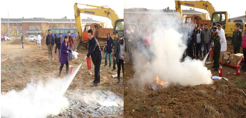 一個(gè)小時(shí)的室內(nèi)培訓(xùn)學(xué)習(xí)后,下午15:30,物業(yè)公司安保主管發(fā)出火警報(bào)警信號(hào),樓內(nèi)報(bào)警器響起,員工在聽到報(bào)警后,迅速有序地疏散到安全地帶(院區(qū)北側(cè)空地)。隨后,大家根據(jù)高新區(qū)消防大隊(duì)劉警官所講的滅火器使用方法,分別進(jìn)行了滅火器操作和滅火練習(xí)。