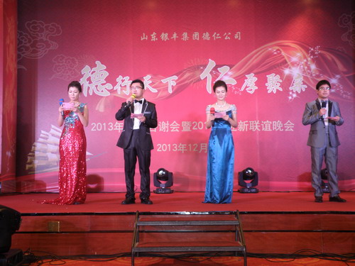 2013年12月21日下午16時(shí),山東德仁經(jīng)濟(jì)貿(mào)易有限公司2013年“德行天下 仁厚聚親”廠商答謝會(huì)暨2014年新春聯(lián)誼晚會(huì)于藍(lán)海大酒店藍(lán)海大廳如期召開(kāi)。本次大會(huì)到會(huì)廠商、經(jīng)銷商代表及社會(huì)各界來(lái)賓共計(jì)130余人,銀豐集團(tuán)董事長(zhǎng)王偉先生、金融投資事業(yè)部總經(jīng)理趙曉陽(yáng)先生、總經(jīng)理助理張伊辰女士、德仁公司總經(jīng)理朱倩女士等領(lǐng)導(dǎo)出席了答謝會(huì)。