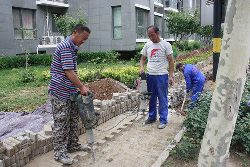 社區(qū)內(nèi)樓上,對建筑外立面進行維修施工的專業(yè)工人,他們是小區(qū)內(nèi)的“蜘蛛人”。一根保險繩,一根作業(yè)繩,懸掛在離地數(shù)十米的高度,不顧天氣炎熱,用專業(yè)精神詮釋了認真的品質(zhì)與一絲不茍的精神。不遠處,更有幾名工人對銀豐花園部分室外主管道進行更換,有的用鐵锨挖掘坑道,有的用電鉆進行地面破土,神情專注,專業(yè)用心。