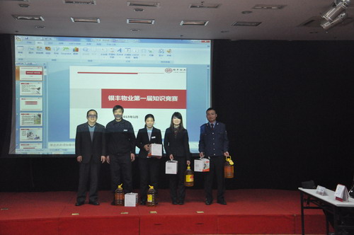2015年1月24日,“銀豐物業(yè)第一屆知識(shí)競(jìng)答”活動(dòng)在銀豐大廈多功能廳舉辦。本屆競(jìng)賽共由五個(gè)代表隊(duì)二十名人員參加,代表隊(duì)選手均是來自各項(xiàng)目的一線員工。題目?jī)?nèi)容涵蓋了物業(yè)管理知識(shí)、安全知識(shí)以及服務(wù)理念等,答題共分為“必答、搶答、風(fēng)險(xiǎn)題”三個(gè)階段。