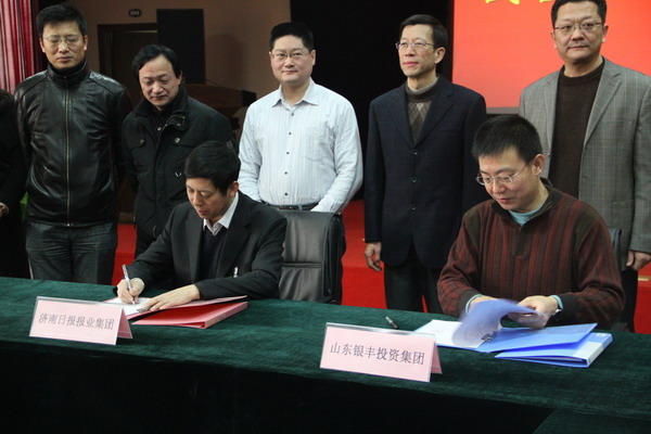 2012年2月9日上午,山東銀豐投資集團(tuán)與濟(jì)南日?qǐng)?bào)報(bào)業(yè)集團(tuán)在銀豐大廈多功能廳正式簽署戰(zhàn)略合作協(xié)議。濟(jì)南日?qǐng)?bào)報(bào)業(yè)集團(tuán)董事長(zhǎng)孫元文書(shū)記、報(bào)業(yè)集團(tuán)下屬六報(bào)一網(wǎng)的各主要負(fù)責(zé)人以及銀豐集團(tuán)董事長(zhǎng)王偉、副總裁劉旭、集團(tuán)公司各部門負(fù)責(zé)人共三十余人出席了簽約儀式。