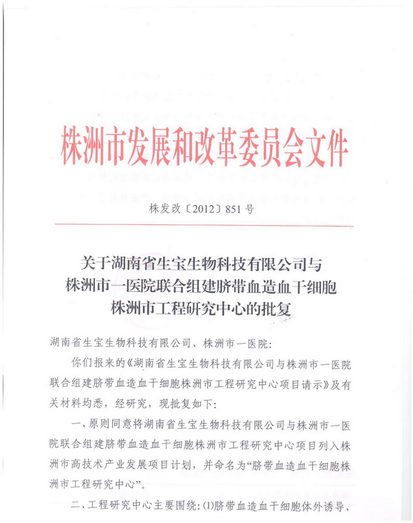 2012年12月26日湖南省生寶生物科技有限公司獲得株洲市發(fā)改委正式批復(fù),原則上同意生寶公司與株洲市一醫(yī)院聯(lián)合組建臍帶血造血干細(xì)胞株洲市工程研究中心。這標(biāo)志著湖南生寶公司今后開展的業(yè)務(wù)將更加規(guī)范化,更加有序。