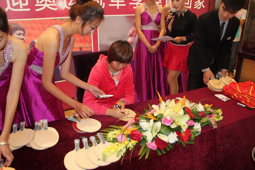 此次迎接奧運(yùn)冠軍入主為鄰,讓銀豐·唐郡住區(qū)廣大準(zhǔn)業(yè)主們顯得異常興奮,大家早早就翹首企盼奧運(yùn)冠軍的到來(lái)!在銀豐·唐郡項(xiàng)目營(yíng)銷中心現(xiàn)場(chǎng),李曉霞及家人認(rèn)真聽(tīng)取了銀豐·唐郡項(xiàng)目置業(yè)顧問(wèn)對(duì)項(xiàng)目的介紹和房型推薦,參觀了銀豐·唐郡項(xiàng)目的樣板間。在現(xiàn)場(chǎng)互動(dòng)的環(huán)節(jié),李曉霞留下了自己的手模,并在球衣和球拍上簽名紀(jì)念。