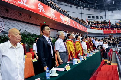 上午9時(shí)整,畢業(yè)典禮正式開始,全場(chǎng)起立奏唱國歌。雄渾的國歌為畢業(yè)典禮格外增添了莊嚴(yán)的色彩。