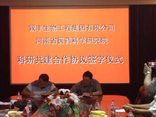 2014年7月8日,銀豐生物集團(tuán)與河南省醫(yī)藥科學(xué)研究院合作協(xié)議簽約儀式在鄭州市隆重舉行,生物集團(tuán)總裁生德偉與河南省醫(yī)藥科學(xué)研究院院長楊波共同簽署了共建協(xié)議。河南省科技廳社發(fā)處處長楊光、鄭州大學(xué)副校長???biāo)、別榮海、科技處處長趙明皞受邀參加簽約儀式。楊光處長在儀式上發(fā)表重要講話,介紹了目前科技部在各省設(shè)立人類遺傳資源庫的政策,表示銀豐生物集團(tuán)與河南省醫(yī)藥科學(xué)研究院強(qiáng)強(qiáng)聯(lián)手共建河南省人類遺傳資源庫是利國利民的好事,科技廳將給予大力支持。