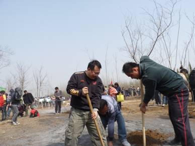 上午10點鐘左右大家集合完畢,隨即乘坐班車來到指定植樹地點。開始種樹后,明確分工,挖坑、選樹苗、扶正、填土、澆水,齊心協(xié)力,一個多小時就種植了十多棵樹苗。短短的一上午時間,大家在舒展筋骨,揮灑汗水的同時,播種下愛心,收獲了綠色和快樂。
